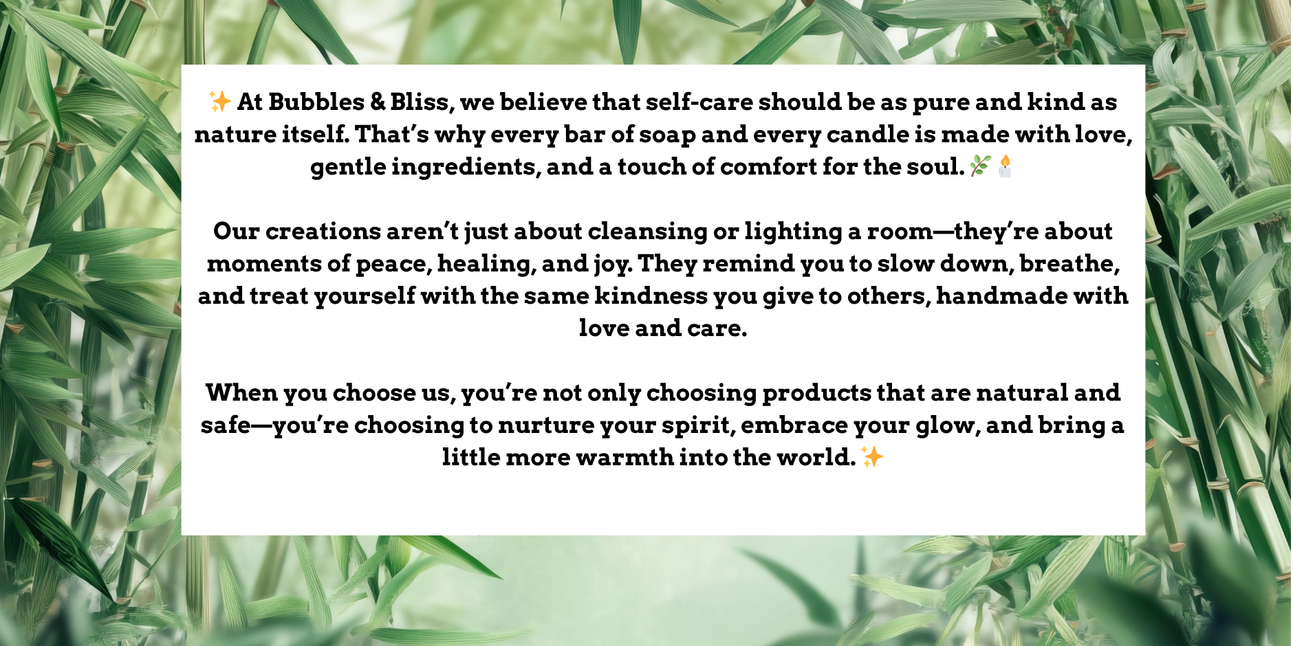Bubbles & Bliss is a handmade candle and soap company built on creativity, care, and heart. Every product is made with love to bring comfort, relaxation, and a touch of everyday joy. From soothing scents to gentle ingredients, Bubbles & Bliss is all about turning simple moments into something special — spreading warmth, kindness, and bliss with every bubble and flame.